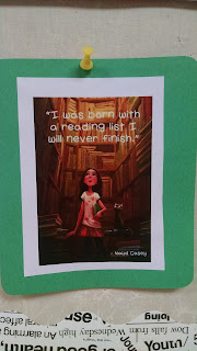 National Library week is April 10-16th this year. To celebrate, my display this week is all about reading and the library. I created a "Pinterest" board, only it is an actual board with physical pins. How else to show diverse enthusiasm for reading?